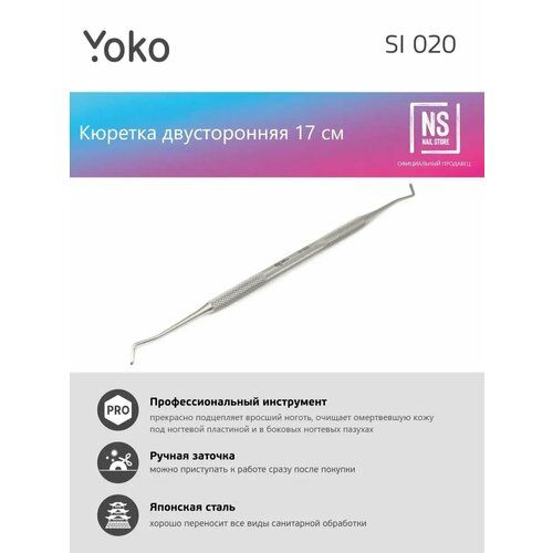 Профессиональный двусторонний шабер YOKO SI 020 с глянцевой поверхностью, кюретка двусторонняя. Изготовлен из высококачественной нержавеющей стали. Устойчив к износу и всем видам стерилизации. Используется как дополнительный инструмент при работе с вросшими ногтями. Длина инструмента 17 см.