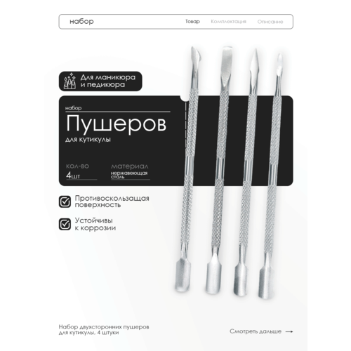 Наш набор инструментов для маникюра и педикюра поможет преобразить пальцы рук и ног. Двусторонние пушеры для ктикулы с различными видами наконечников помогают справиться с частыми проблемами ногтей. Кюретка упрощает работу с вросшими ноготками, классическая лопатка убирает кутикулу, а наконечник в виде топорика удаляет грязь из-под ногтей. Часто для облегчения процедуры и достижения максимального эффекта используется ремувер.