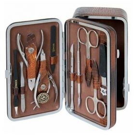 Состав набора: ножницы для кутикулы, ножницы для ногтей, кусачки для кутикулы, кусачки для педикюра, триммер, пинцет, пилка алмазная, пластиковая маникюрная палочка, шабер металлический - 2 шт.
