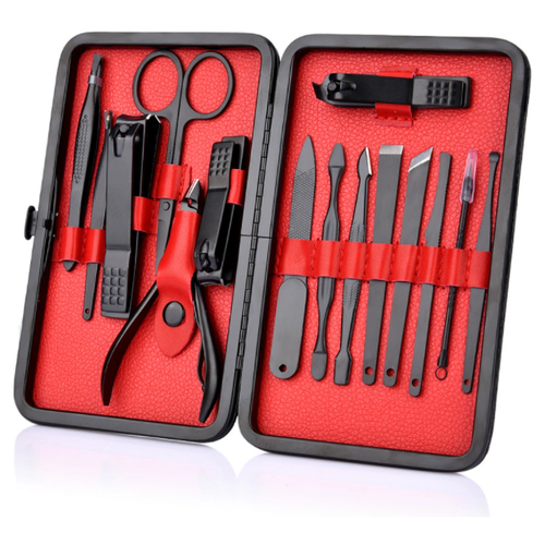 Профессиональный маникюрный набор из 15 предметов MyPads A156-951 для маникюра, педикюра, инструменты по уходу за лицом из высококачественной нержавеющей стали с черным матовым покрытием и стильным чехлом из экокожи красного цвета Многофункциональный набор, все инструменты которого изготовлены из высококачественной нержавеющей стали. Пятнадцать предметов предназначены для ухода за руками. ногами, лицом. Материал, аккуратные швы оригинального футляра из искусственной кожи делают данный набор еще более привлекательным и подходящим для подарка друзьям и членам семьи. Комплектация ножницы, кусачки прямые, кусачки под углом, лопатка для кутикул, пинцет, триммер, пилка для ногтей, игла маникюрная, щеточка и др. Вес 260 грамм