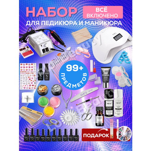 Вы сможете сделать маникюр полностью благодаря этому набору Набор для маникюра с лампой. UF / LED лампа для ногтей подходит для всех видов покрытия. Мощная лампа для маникюра бережно высушит гель-лак на ногтях и поможет сделать наращивание ногтей. Аппарат для маникюра и педикюра (на выбор mercedes или nail drill), в комплекте насадки для аппаратного маникюра. Алмазные насадки и шлифовальные насадки обеспечат Вам ухоженные руки. В комплект также входит набор фрез. Аппарат для маникюра профессиональный. Аппарат с плавным переходом и реверсом - обратное вращение фрезы. Низкий уровень шума и отсутствие вибрации при выполнении работ. Маникюрный и педикюрный аппарат подходит для базовой чистки ногтевой арки, обработки кутикулы, снятия лака, шлифовки, полировки, коррекции и наращивания ногтей, моделирования любой формы. Это средство для очищения кутикулы и с ним также доступна шлифовка ногтевой пластины. Качественный аппарат для профессионального и начинающего мастера, включая маникюр в домашних условиях, маникюр самой себе. Щеточки для маникюра позволят работать без пыли, получить чистый маникюр. В подарок масло для кутикулы, для бархатной кожи рук. Чтобы сделать обрезной маникюр у Вас будут кусачки / щипчики для ногтей качественные, а также маникюрные ножницы. Для самостоятельного маникюра Вам также понадобятся апельсиновые палочки для кутикулы, бафы для полировки ногтей, чтобы у Вас были гладкие блестящие ногти. Набор лаков для ногтей. Набор гель-лаков разных цветов: розовый, персиковый или нюд, красный, желтый, зеленый, голубой, фиолетовый, коричневый, черный, белый. Лак антиаллергенный, подходит для чувствительной кожи, обеспечивает легкое нанесение, плотный насыщенный цвет, не полосит. Удобная кисточка. В комплект входят разделители для пальцев. У Вас также будет палитра для гель-лаков / типсы для гель-лака. Вы получаете все для наращивания ногтей. Гель для наращивания ногтей белый, розовый и прозрачный. Вы легко сможете самостоятельно нарастить себе ногти, сделать длинные ногти. Гель однофазный, выравнивающийся. Также есть полигель для наращивания, для ремонта трещин ногтей, для выравнивания ногтевой пластины. Вы получаете кисть для наращивания ногтей и шпатель для наращивания ногтей акригелем, формы для наращивания ногтей. Для подготовки ногтей Вы получите праймер для маникюра. Он работает как обезжириватель для маникюра. Это кислотный праймер без липкого слоя. И безворсовые салфетки, чтобы у Вас был идеальный маникюр. База - основа для создания маникюра. Выравнивает, не вызывает раздражения, подходит для тонких ногтей и слабых ногтей. Антиаллергенная база для маникюра. Для снятия маникюра в комплекте специальная жидкость, именно средство для снятия гель-лака с провитамином B5 и дополнительно жидкость для обезжиривания ногтей и снятия липкого слоя с витамином Е. Для дизайна ногтей Вы получите стразы цветные. Серебристая лента для современного стильного дизайна. Цветные блестки для маникюра. Золотая поталь для дизайна. Гель-паутинка для дизайна ногтей белого цвета. Набор наклеек – наклейки для ногтей, для маникюра и для педикюра. Набор кистей. Кисточки для рисования на ногтях и чтобы сделать покрытие под кутикулу. Кисти разной формы, разного размера, для рисунка, для французского маникюра. Для долгой носки и крепких ногтей, для ук