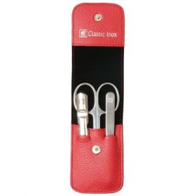 Футляр набора выполнен из натуральной кожи красного цвета, что придает ему элегантный и стильный вид. В комплекте с инструментами идут ножницы для ногтей, пилочка и пинцет.