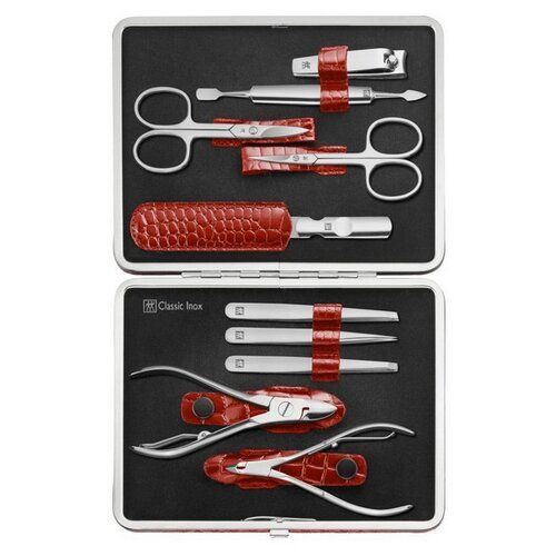 Маникюрные наборы Zwilling Classic Inox от ведущего мирового производителя маникюрных принадлежностей - немецкого концерна Zwilling (г. Золинген, Германия) визуально привлекательны стильными, полированными инструментами и высококачественными кожаными футлярами.Инструменты изготовлены из высококачественной нержавеющей стали. Футляр красного цвета из натуральной телячьей кожей с выделкой "крокодил".В набор входит:Кусачки для ногтей, 11 смКусачки для кутикулы, 11 смНожницы для ногтей, 9 смНожницы для кутикулы, 9 смПинцет скошенный, 9 смПинцет прямой, 9 смПинцет остроконечный, 9 смПилка сапфировая, 13 смДвойной инструмент для отодвигания кутикулы и чистки под ногтями, 12 смЩипчики для ногтей, 6 смУход: Инструменты предохранять от падения на пол. Время от времени смазывать маслом область соединения, винт, внутреннюю часть и режущие кромки кусачек и ножниц. Использовать только по назначению Цвиллинг Бьюти Груп ГмбХ, Грюневальдер Штр., 14-22 Д-42657 Золинген, Германия (Zwilling Beauty Group GmbH, Grunewalder Str.14-22 D-42657 Solingen Germany)