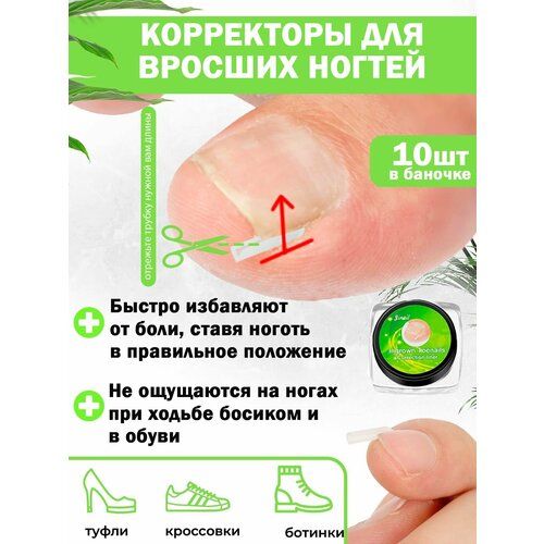 Корректирующие полоски - отличное решение для людей с проблемой врастания ногтей. Корректор не чувствуется, не приносит дискомфорт и не мешает ходьбе. Больше не пригодится пилка для ногтей, ножницы и щипцы, никакой аппарат для педикюра не потребуется. Корректор от вросшего ногтя решит эту проблему за вас Наклейки на ногти помогут выровнять рост ногтя и сохранить его форму правильной. Набор для ногтей защитит нежную кожу пальца и не позволит ногтю врасти снова. Подарите себе радость движения и комфорт. Подходит как женщинам, так и мужчинам.