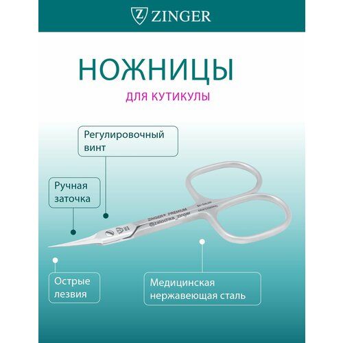 Ножницы маникюрные для кутикулы Zinger премиум серии с тонкими лезвиями. Инструмент выполнен из стали с покрытием серебро. Удобная эргономичная форма и острые тонкие лезвия. Продукцию компании Zinger уже много лет выбирают профессиональные мастера маникюра и педикюра. Подходят как для салонного ухода, так и для домашних процедур. Соединённые между собой винтом полотна, дают возможность регулировать плотность прилегания и повторить заточку. 100% оригинал. Чехол в комплекте защищает супер тонкие кончики ножниц. Ножницы предназначены только для ухода за кутикулой и заусенцами