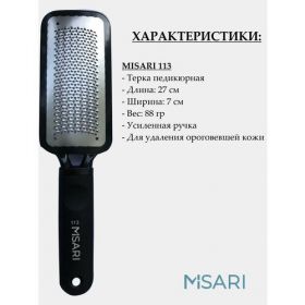Терка для ног MISARI 113 имеет стильный черный и серебристый цвет, который подойдет к любому интерьеру. Длина инструмента составляет 270 мм. В упаковке поставляется одна терка.