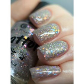 лак серо-бежевый розоватого подтона с серебряным светоотражающим глиттером и кусочками разноразмерной оранжево-розовой и голубой разноразмерной слюды.Допускается нанесение в 1-3 тонких слоя. Финиш песочный.
