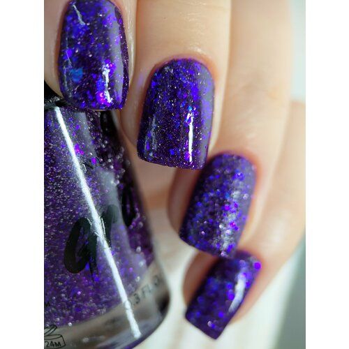 Temptation - насыщенный фиолетовый лак с серебряным светоотражающим глиттером и кусочками рваной разноразмерной синей слюды.Допускается нанесение в 1-3 тонких слоя. Финиш песочный.