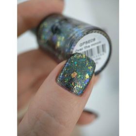 Лак для ногтей сушка без лампы Grattol Over the moon - кофейно-серая вуаль с жемчужно-зелено-сиреневым и медно-розовым пигментом Аврора, с синей поталью, с разноразмерной рваной зелено-синей опаловой и золотой слюдой.