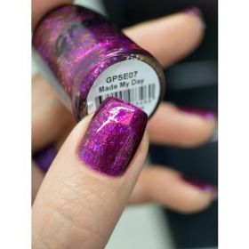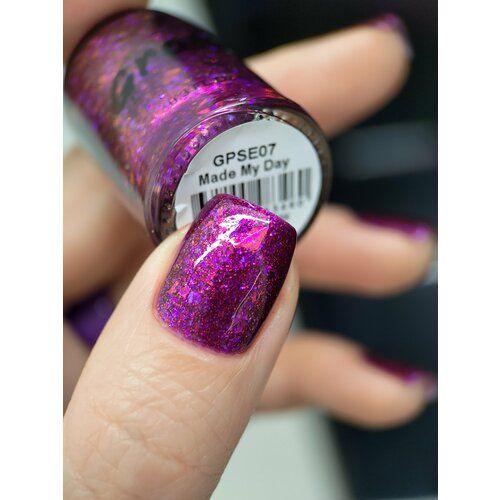 Лак для ногтей сушка без лампы Grattol Made My Day - фиолетово-баклажановое желе с золотисто-зеленым и тилово-синелетовым пигментом Аврора, с рваной разноразмерной красной и синелетовой слюдой.