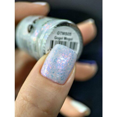 Grattol Gogol Mogol - молочное креле с голубым подтоном, с опаловой разноразмерной рваной розово-золотистой слюдой и синим переливомДопускается нанесение в 1-3 тонких слоя.