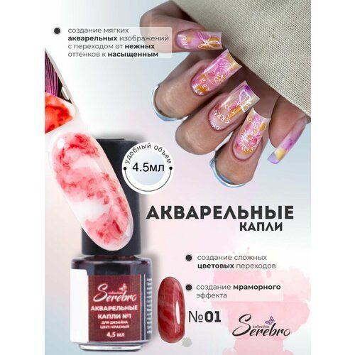 НАЙТИ ВЫГОДНЕЕ - Лак для дизайна ногтей Serebro Акварельные Капли №01, красный, 4,5 мл.