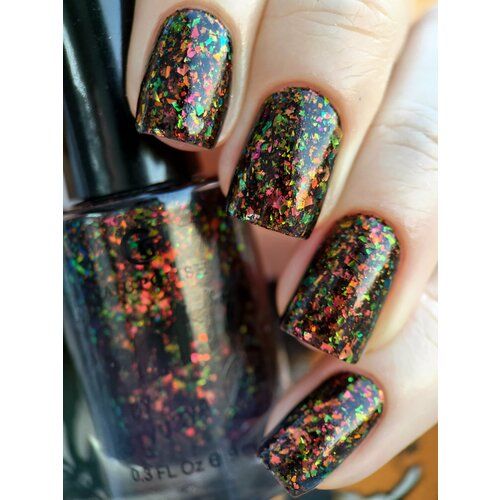 Лак для ногтей сушка без лампы Grattol Khokhloma чёрное полупрозрачное желе, с чёрной металлизированной поталью, с мультихромной зелёно-синей поталью и кораллово-розово-персиковой слюдой.