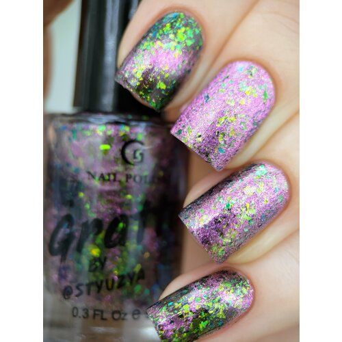 Лак для ногтей сушка без лампы Grattol Lady D-inosaur - прозрачный магнитный лак с мультихромной поталью и розовым магнитным пигментом.