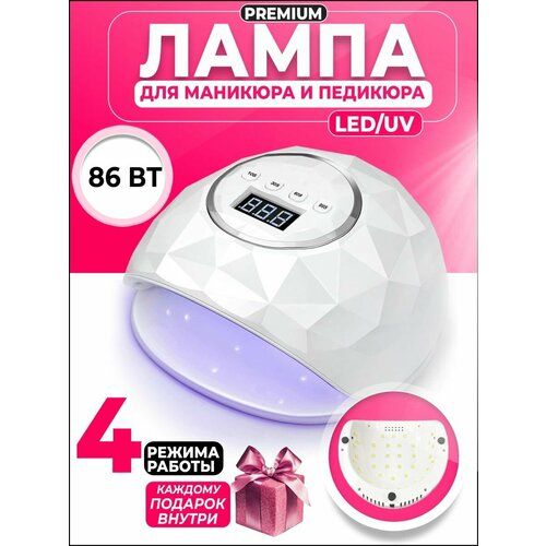 Профессиональная светодиодная лампа для маникюра LED-UV F6 белая мощностью 86 w c новой технологией двойного источника света, охватывает широкий спектр ультрафиолетового диапазона, подходит для сушки всех видов гель-лаков, биогелей, полигелей, акригелей. Диодные лампочки бусины расположены по контуру, 39 светодиода. Маникюрный и педикюрный аппарат оснащен таймером на 10,30, 60 и 99 секунд для автоматического использования. Есть режим бесконечности, который активируется сенсором движения до тех пор, пока рука находится в лампе. Сенсорная панель, светящийся дисплей экран, для контроля за временем.