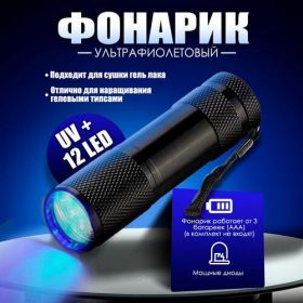 Представляем вам портативный ультрафиолетовый фонарик для сушки ногтей UV + 12 LED, идеальное решение для проведения профессионального маникюра прямо у себя дома Фонарик работает от 3 "мизинчиковых" батареек (ААА) - Батарейки НЕ идут в комплекте.
