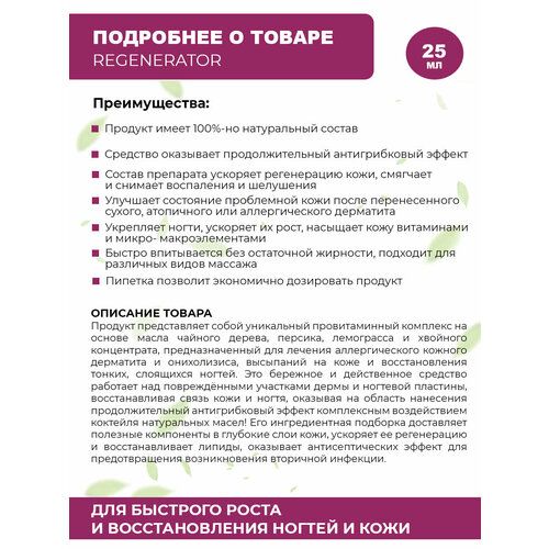Препарат при регулярном применении быстро снимает воспаления, заживляет трещины, смягчает и уменьшает зуд и шелушения, вызванные аллергическим дерматитом (сухой дерматит, атопический дерматит или проявление аллергии на гель-лак или жидкости для его нанесения/снятия). Также он показывает высокую результативность при лечении грибковых заболеваний ногтей, механических повреждений, старых травм ногтевой пластины или результата перепиливания либо ожога ногтевой пластины. Регенератор улучшает состояние проблемной кожи, повышая ее защитные свойства, восстанавливает кожный иммунитет. Препарат восстанавливает ногтевую пластину при дистрофиях ногтей, способствует укреплению ослабленных ногтей и ускоряет их рост, возвращает здоровый вид, насыщает кожу витаминами А, Е, К и микро- макроэлементами.