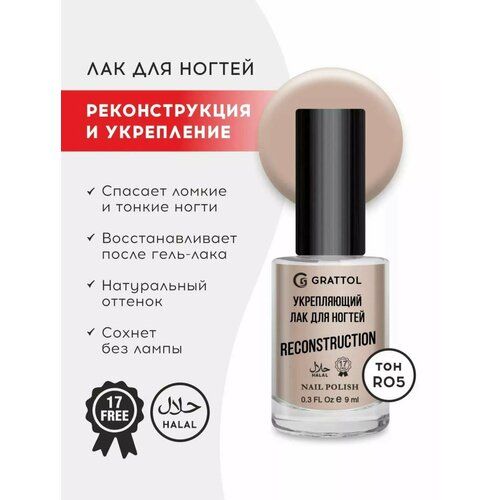 НАЙТИ ВЫГОДНЕЕ - Grattol Reconstruction 5 - Укрепляющий лак для ногтей, телесный, сушка без лампы, Халяль, 9 мл