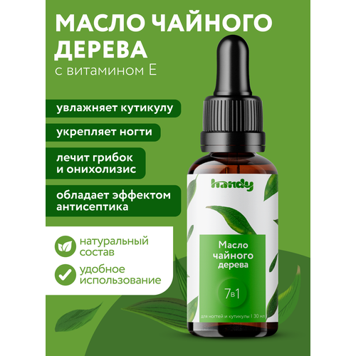 Натуральное масло чайного дерева 7в1 Handy – это многофункциональное средство для лечения и ухода за ногтями и кутикулой, а также за кожей, волосами и телом. Универсальное средство от грибка ногтей и онихолизиса обогащено витаминами Е и С, которые усиливают эффективность чайного дерева. Наше масло чайного дерева глубоко увлажняет и смягчает кожу вокруг ногтей, улучшая внешний вид вашего маникюра. Более того, масло восстанавливает ногтевую пластину, делая ногти крепкимии и ровными. Масло чайного дерева избавляет ногти от ломкости и расслоения. Большой объем масла (30 мл)и удобная пипкетка, гарантирующая экономный расход, обеспечивают длительное использование масла как для ногтей и кутикулы, так и для волос и кожи лица или рук. Масло чайного дерева может помочь при борьбе с дерматитом, угревой сыпью и воспалениями – важно использовать небольшое количество масла, чтобы не шокировать кожу лица и тела.