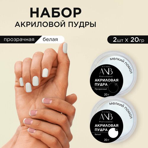 Профессиональный набор прозрачной и белой акриловой пудры для ногтей от АНБ Профессионал для наращивания и укрепления ногтей изготовлена по новой формуле собственной разработки. Пудра для наращивания подходит для ремонта, стильного дизайна и короткого наращивания. Профессиональная маникюрная пудра с мелким помолом, легка в нанесении на ноготь и очень экономична за счет мелкой фракции. Предотвращает расслаивание и сколы, создает дополнительную жесткость без утолщения ногтевой пластины. Отлично зарекомендовала себя в моделировании и наращивании ногтей, а также в создании объемного 3Д дизайна. При взаимодействии с мономером, пудра становится пластичной и однородной как акриловый гель или акригель, легко распределяется по поверхности ногтя, создавая гладкую поверхность без трещин и пузырей.