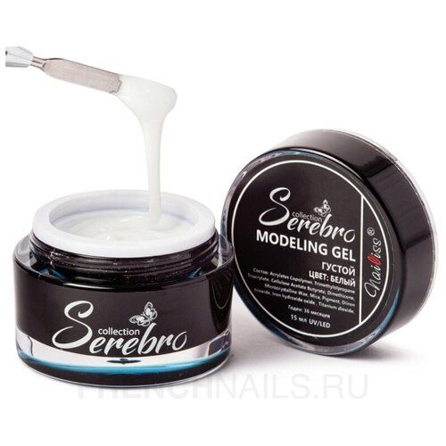 Serebro, Густой моделирующий гель — гель густой консистенции для наращивания ногтей Серебро. Подходит для создания большой длины ногтей, для техники наращивания без опила, а также выравнивания натуральных ногтей. Может использоваться для аквариумного дизайна. Имеет высокую прочность после сушки. Перед моделированием требуется нанесение базы для ногтей.