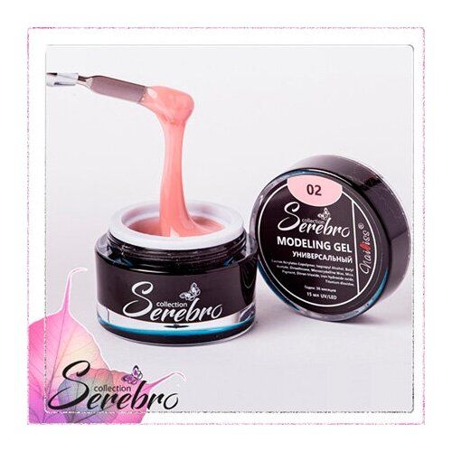 Жидкой консистенции, Сверхпрочный, не растекается. Подходит для тонких работ, например, для выкладки подложки, для выравнивания и доработки. Требуется подложка в виде каучуковой базы. Плотные очень красивые нюдовые цвета идеально подойдут к любым оттенкам кожи. — Универсальный моделирующий гель Modeling Gel Serebro №2, 15 мл. Официальный представитель Serebro.