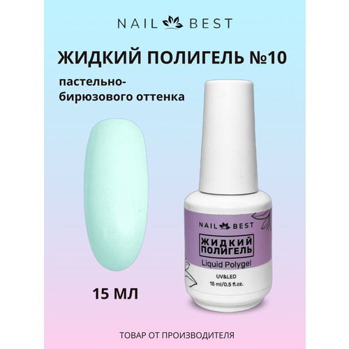 Liquid Polygel №10, 15 мл / Жидкий полигель пастельно-бирюзового оттенка, средне-густой консистенцией и высокой степенью вязкости, не дает усадку и отлично самовыравнивается, имеет липкий слой. Слабокислый материал с показателем PH 5.