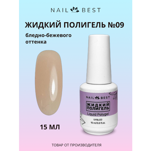 Liquid Polygel №09, 15 мл / Жидкий полигель бледно-бежевого оттенка, средне-густой консистенцией и высокой степенью вязкости, не дает усадку и отлично самовыравнивается, имеет липкий слой. Слабокислый материал с показателем PH 5.