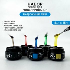 Профессиональный набор витражных гелей для наращивания и моделирования ногтей радужный МИР. В наборе 5 штук по 15гр трехфазных УФ гелей №24 Дюшес, №25 Тархун, №26 Морская гладь, №34 Черное зеркало, №36 Красное море. Гели это идеальный профессиональный материал для создания качественного французского и аквариумного маникюра. Подходит для арочного моделирования и укрепления натуральных ногтей, наращивания и ремонта, выравнивания и донаращивания. Гель для моделирования обладает пластичностью и позволяет легко укрепить, моделировать и корректировать форму ногтей. Используется для техники без опила и идеально подходит для создания френча. Гели АНБ относятся к гелям средней жесткости, при работе с длинными и экстра длинными ногтями рекомендуем делать подложку из полигель или акрилового материала (акригель).