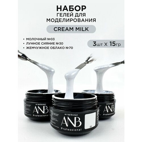 Профессиональный набор жемчужно-кремовых гелей для наращивания и моделирования ногтей CREAM MILK. В наборе 3 штуки по 15гр трехфазных УФ гелей №03 Молочный, №30 Лунное сияние, №70 Жемчужное облако. Гели это идеальный профессиональный материал для создания качественного французского и аквариумного маникюра. Подходит для арочного моделирования и укрепления натуральных ногтей, наращивания и ремонта, выравнивания и донаращивания. Гель для моделирования обладает пластичностью и позволяет легко укрепить, моделировать и корректировать форму ногтей. Используется для техники без опила и идеально подходит для создания френча. Гели АНБ относятся к гелям средней жесткости, при работе с длинными и экстра длинными ногтями рекомендуем делать подложку из полигель или акрилового материала (акригель).