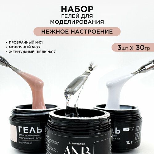 Профессиональный набор однотонных нюдовых гелей для наращивания и моделирования ногтей нежное настроение. В наборе 3 штуки по 30гр трехфазных УФ гелей №01 Прозрачный, №03 Молочный, №07 Жемчужный. Гели это идеальный профессиональный материал для создания качественного французского и аквариумного маникюра. Подходит для арочного моделирования и укрепления натуральных ногтей, наращивания и ремонта, выравнивания и донаращивания. Гель для моделирования обладает пластичностью и позволяет легко укрепить, моделировать и корректировать форму ногтей. Используется для техники без опила и идеально подходит для создания френча. Гели АНБ относятся к гелям средней жесткости, при работе с длинными и экстра длинными ногтями рекомендуем делать подложку из полигель или акрилового материала (акригель).