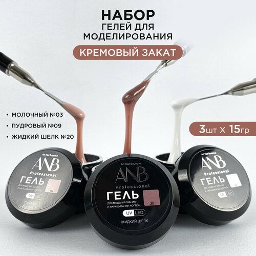Кремовый закат Профессиональный набороднотонных гелей для наращивания и моделирования ногтей. Набор состоит из 3 штук трехфазных УФ гелей от ANB Professional: №03 Молочный 15гр, №09 Пудровый 15гр, №20 Жидкий шелк 15гр. Гели это идеальный профессиональный материал для создания качественного французского и аквариумного маникюра. Подходит для арочного моделирования и укрепления натуральных ногтей, наращивания и ремонта, выравнивания и донаращивания. Гель для моделирования обладает пластичностью и позволяет легко укрепить, моделировать и корректировать форму ногтей. Используется для техники без опила и идеально подходит для создания френча. Гели АНБ относятся к гелям средней жесткости, при работе с длинными и экстра длинными ногтями рекомендуем делать подложку из полигель или акрилового материала (акригель). Безопасная формула 11 Free сохранит здоровье ваших ногтей. Гель гибкий, не хрупкий и не ломкий отлично самовыравнивается. Не заметен у линии кутикулы при отрастании. Подходит как мастерам для профессионального использования в салонах, так и в домашних условиях новичкам. Не течет, хорошо держит форму, не дает сколов и отслоек. При полимеризации выделяется минимальное количество тепла, что комфортно и приятно клиентам, особенно с чувствительными и поврежденными ноготками. После сушки и в процессе носки не желтеет. Builder Gel сохраняет отличный внешний вид покрытия до 6 недель. Способ применения 1. Подготовьте ногтевую пластину. 2. Нанесите тонкий слой базы для ногтей и просушите его в LED лампе. 3. Выполните моделирование ногтевой пластины гелем с помощью кисточки, просушите ноготь в УФ 2 минуты, в гибридной и LED лампе 60 секунд. Липкий слой снимать только после полного остывания 4. При необходимости, нанесите цветной гель лак для ногтей (красный, розовый и др.) 5. Полученный результат закрепите глянцевым или матовым топ для ногтей. Просушить в лампе