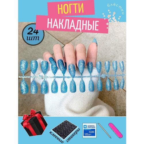 НАЙТИ ВЫГОДНЕЕ - Комплект накладных ногтей С блёстками 24шт + клеевые стикеры для фиксации 24шт, голубой цвет