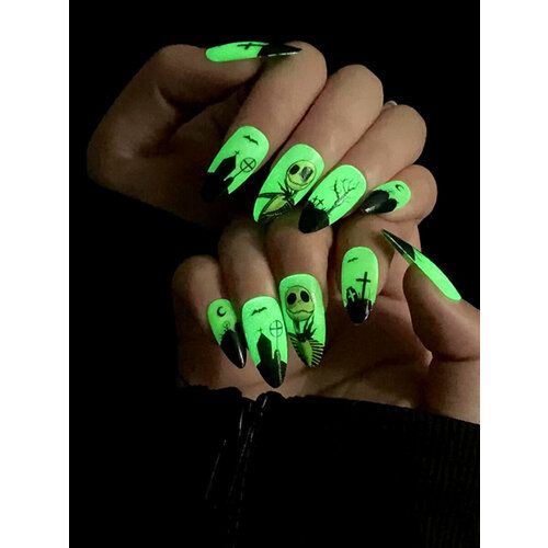 Ногти накладные хэллоуин неон светящиеся для подростков, для девочек, детские, для детей. В наборе представлены 24 типсы разного размера и жидкий клей сильной фиксации. Накладные ногти с дизайном выполнены из прочного материала, а значит, прослужат долго.