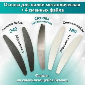 Маникюрный набор предлагает вам металлическую основу для пилки для ногтей и два сменных файла абразивностью 180 и 240. Основа изготовлена из прочной и долговечной стали, что гарантирует долгий срок службы.