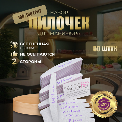 НАЙТИ ВЫГОДНЕЕ - NailsProfi, Пилки для ногтей OPI овал лодочка полумесяц 100/180, 50 шт, набор, пилки, пилочки для маникюра