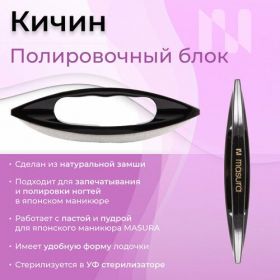 Применение полировочного блока для японского маникюра Masura гарантирует достижение глянца и здорового вида ногтевой пластины. Кичин нельзя подвергать влажной обработке и класть в сухожар. Аккуратно счистите с него остатки пасты и пудры апельсиновой палочкой или щёточкой, после чего положите в УФ-стерилизатор. Если вы работаете в салоне, рекомендуем приобретать кичины отдельно для каждого клиента. Полировочная замша кичинов - натурального происхождения и может быть вырезана из разных частей замшевого полотна.