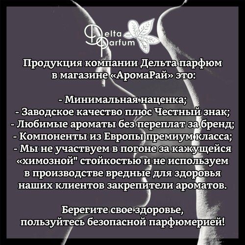Базовые ноты: грейпфрут , мускус , сандал - Вся парфюмерия Delta parfum изготавливается на основе Немецких (Drom Fragrances) композиций с соблюдением всех необходимых производственных процессов и норм качества, исключительно в заводских условиях, имеет необходимые сертификаты качества. Строгое соблюдение технологий на наших заводах с многолетней историей успешного развития- гарантирует высочайшее качество изготовления парфюмерии, а применение исключительно Европейских ароматических композиций- позволит Вам ощутить уже известные, знакомые ароматы, но по значительно более низкой цене.