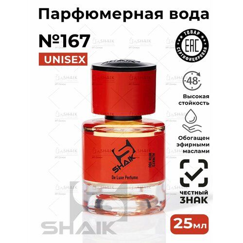 SHAIK - сертифицированная номерная парфюмерия. Ароматы SHAIK относятся к духам и обогащены эфирными маслами, благодаря чему имеют стойкость до 48 часов. SHAIK 167 - восхитительный, неповторимый, страстный и манящий парфюм для мужчин и женщин. Пирамида аромата начинает раскрываться деликатными нотами жасмина и шафрана. В сердце отчётливо слышны благородные, глубокие древесный янтарь и серая амбра. Восхитительный шлейф обеспечивает хвойный аккорд из нот еловой смолы и белого кедра.