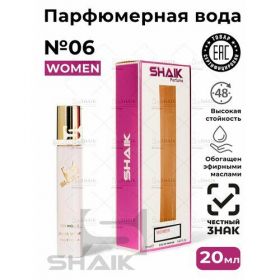 SHAIK 06 – пленительный, элегантный аромат. Создан для женщин, ценящих изысканность и стиль. Верхние ноты взрываются от свежести сочностью мандарина, нежным водяным жасмином и цветком имбиря. Насыщенность соли и сладость ванили противостоят друг другу и рождают отличный тандем. В шлейфе композиции сливается восточный сандал, кашемировое дерево и теплая амбра.