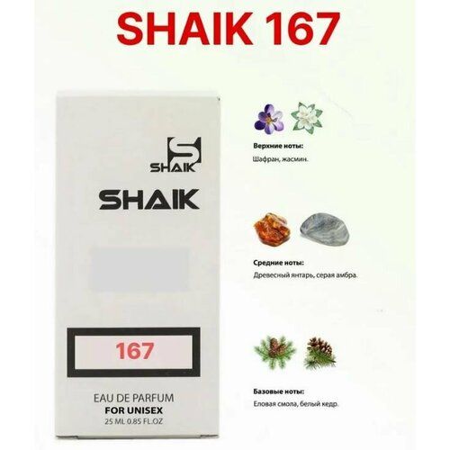Парфюмерия Shaik обогащена эфирными маслами, благодаря чему имеют стойкость аромата до 48 часов. Верхние нотыжасмин, шафран Ноты сердца амбра Базовые нотыкедр, хвоя.