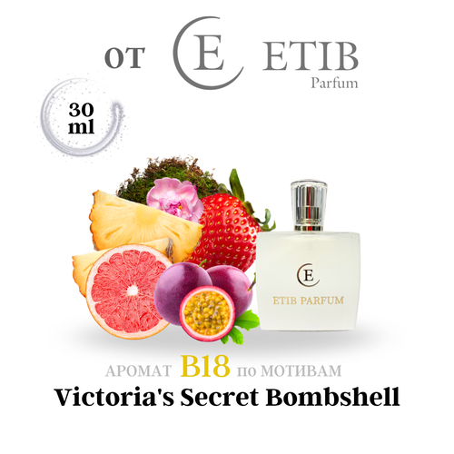 Продукция ETIB Parfum имеет свой уникальный концепт и индивидуальный дизайн. Партнеры в производстве известные парфюмерные дома Франции "Argeville" и "Mane". В 2017 году компания впервые появилась на рынке СНГ, открыв собственное производство в Беларуси. Ароматы ETIB Parfum держат от 12 часов на коже и от 2-х дней на одежде. Парфюмерная композиция В18 вошла в семейство ароматов фруктовые, цитрусовые, цветочные. Этот дерзкий и соблазнительный букет создан специально для роковой дамы, чье неожиданное появление всегда производит фурор, подобный эффекту разорвавшейся бомбы. Аромат идеально подойдет для беззаботного летнего отдыха. Композиция букета соединила в себе ноты ванильной орхидеи, страстного пиона и экзотической маракуйи.