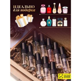 Уникальная возможность познакомиться поближе с легендарными ароматами известных мировых брендов. Микс из 10 шлейфовых ароматов позволит каждый день выбирать новое настроение: от легкого и свежего до соблазнительного и таинственного. Bombshell от Victoria’s Secret яркий аромат с фруктовыми и цветочными нотами. Настоящая находка для любительниц сладкой парфюмерии. L'Imperatrice от D& G понравится каждой женщине. С таким парфюмом вы поистине почувствуете себя императрицей. Аромат с нежнейшими нотками киви и розового перца, арбуза и лимонного дерева. Jadore от Christian Dior роскошный цветочно-фруктовый аромат, наполненный чувственной свежестью и очарованием. Bright Crystal от Versace сочетает в себе выразительность и мягкость, притягивает и чарует своей легкой изысканностью и утонченностью. Angel demon le secret от Givenchi это цветочный аромат очаровывает своей водно-цветочной композицией. Сhance от Chanel показатель отменного вкуса, изысканности и женственности. Несмотря на свою огромную популярность, все также обретает поклонников. Amor Amor от Cacharel парфюм для молодых, счастливых и влюбленных. За короткий срок обрел себе славу бестселлера. Erba Pura от Xerjoff мягкий и современный парфюм. Не оставит равнодушным ни кого. Kirke от T. Terenzi для тех, кто хочет выделиться, подчеркивая вашу красоту и обаяние. Сочетает цветочные и фруктовые ноты, создавая восхитительную, чуть терпкую сладость. Fleur narcotique от Ex Nihilo олицетворяет роскошь. Это соблазнительно-яркий и современный парфюм, его действительно можно назвать идеальным. Набор из 10 мини пробников по 3 мл имеют дозатор и упакованы в фирменную коробку, что позволит вам сделать прекрасный подарок девушке-подростку или стильной и современной женщине, которая знает толк в качественной косметике и парфюмерии. Каждый аромат уникальный, создаст неповторимый образ и подчеркнет вашу индивидуальность. Подойдет как для повседневного использования, так и для особых моментов. Выбери свой идеальный аромат