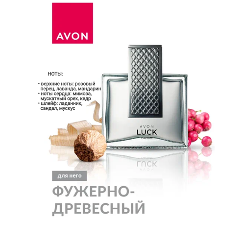 Avon Luck (лак духи люк лук парфюмерная вода 75мл мужской аромат парфюм эйвон туалетная духи мужская) - аромат твоей удачи, вдохновляющий на новые свершения и позволяющие почувствовать вкус роскошной жизни и настоящего успеха. Особый ингредиент женского аромата - ночной цереус. Цветок, раскрывающийся ночью, 1 раз в году, что делает его редким и эксклюзивным ингредиентом. В мужском аромате - это мускатный орех, придающий аромату богатое звучание и глубину. Мужской древесно-амбровый аромат - в концентрации туалетной воды. Розовый перец, мускатный орех и сандал подчеркнут харизматичность и сексуальность его обладателя. Любая женщина обернется вслед мужчине в аромате Avon Luck.