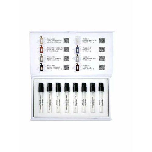 Чтобы вы могли примерить на себя лучшие образцы парфюмерии Trussardi, наши эксперты составили для вас набор из восьми пробников. В него входят восемь унисекс-парфюмов, которые могут носить представители обоих полов. Все ароматические композиции отличаются стилем и гармоничностью, стойкостью и шлейфовостью звучания.