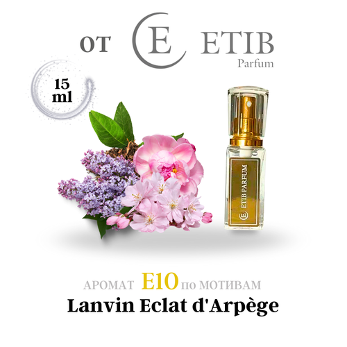 Продукция ETIB Parfum имеет свой уникальный концепт и индивидуальный дизайн. Партнеры в производстве известные парфюмерные дома Франции "Argeville" и "Mane". В 2017 году компания впервые появилась на рынке СНГ, открыв собственное производство в Беларуси. Ароматы ETIB Parfum держат от 12 часов на коже и от 2-х дней на одежде. Аромат E10 относится к группе цветочные фруктовые. Роман между женщиной и этими духами не просто мимолетный флирт, а чистое и нежное чувство. Он никогда не будет покидать вас, пока вы остаетесь самой собой, и будет сопровождать свою хозяйку повсюду, подчеркивая обаяние и красоту. С этими духами вас заметят в любой толпе. Композиция аромата включает ноты: Пион, цветы персика, лист чая, зеленая сирень, амбра, мускус, китайский османтус, петитгрейн и кедр.