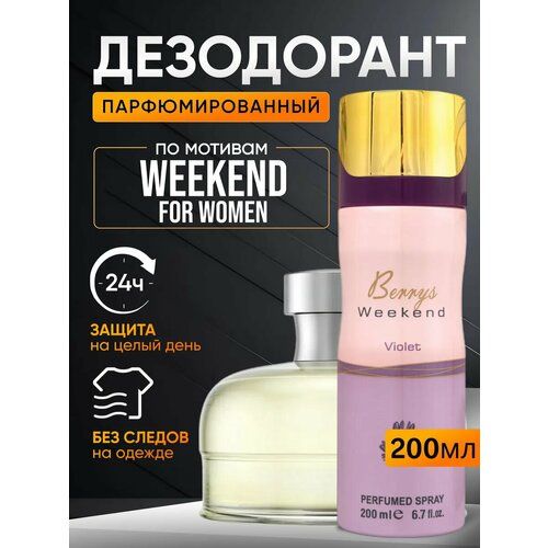 Дезодорант по мотивам Burberry Weekend for Women ( Барбери Уикенд Фо Вумен, Барбери Фор Вумен, Уикенд ) - это аромат для женщин, он принадлежит к группе цветочные.