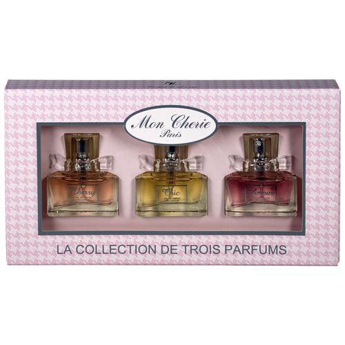 Подарочный набор "Mon Cherie" включает в себя три миниатюрные флакончика туалетной воды женского аромата "Mon Cherie" вместимостью 10 мл каждый. Флакончики выполнены в розовом цвете, что придает им элегантный и женственный вид.