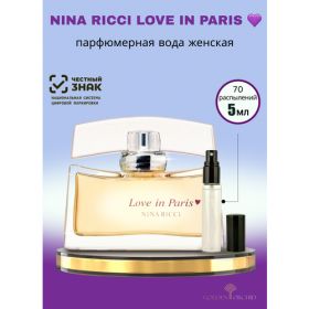 Обладательницей парфюма может быть стать чувственная тёплая женщина, которая не может представить себе жизнь без красоты поэтического города всех влюблённых и без романтических вечеров. Она окутывается этим ароматом, как нежнейшей шалью: тёплый и всегда неразгаданный, он её спутник везде, будто сокровенное воспоминание. Эта волшебная ночь укутывает её в такую тайну, которая останется неразгаданной. Парфюмерная композиция включает в себя начальные ноты листьев фиалки, итальянского бергамота, звёздчатого аниса и розы. Из нот абрикоса, белого пиона и жасмина. Оставляет за собой шлейф мускуса, ванили, кедра и сандала. Духи Nina Ricci Love In Paris сочетают в себе группу цветочных, древесных и пряных ароматов.