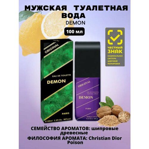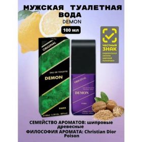 Мужская туалетная вода Demon - это аромат, который был создан для сильных, уверенных, авторитетных мужчин, которые хотят подчеркнуть свою индивидуальность и вкус. Семеймтво ароматов: шипровые, древесные. Философия аромата: Christian Dior Poison. Туалетная вода для мужчин Demon открывается легким и свежим аккордом лимона и бергамота, добавляя аромату искристости и прозрачности. В сердце вас окутает запах экзотического аниса, оставив объектиный и пощекотавший букет неподражаемости лакомства. В базовых нотах заметны акценты ветивера и свежего мускуса, которые придают аромату глубину и стойкость. Парфюмированная вода для мужчин виртуозно сочетает в себе свежие цитрусовые, глубокие земные и ароматные пряные ноты. Он будет прекрасным подарком для современного мужчины, окутывая его своим благородством и величественностью. Аромат можно использовать в любой ситуации: на работе, на вечеринке, на свидании или в обычный день, что подчеркнет индивидуальность, уверенность в себе и хороший вкус. Духи Demon станут идеальным подарком на День рождения, Юбилей, Новый год, 23 февраля, День святого Валентина или любой другой праздник.